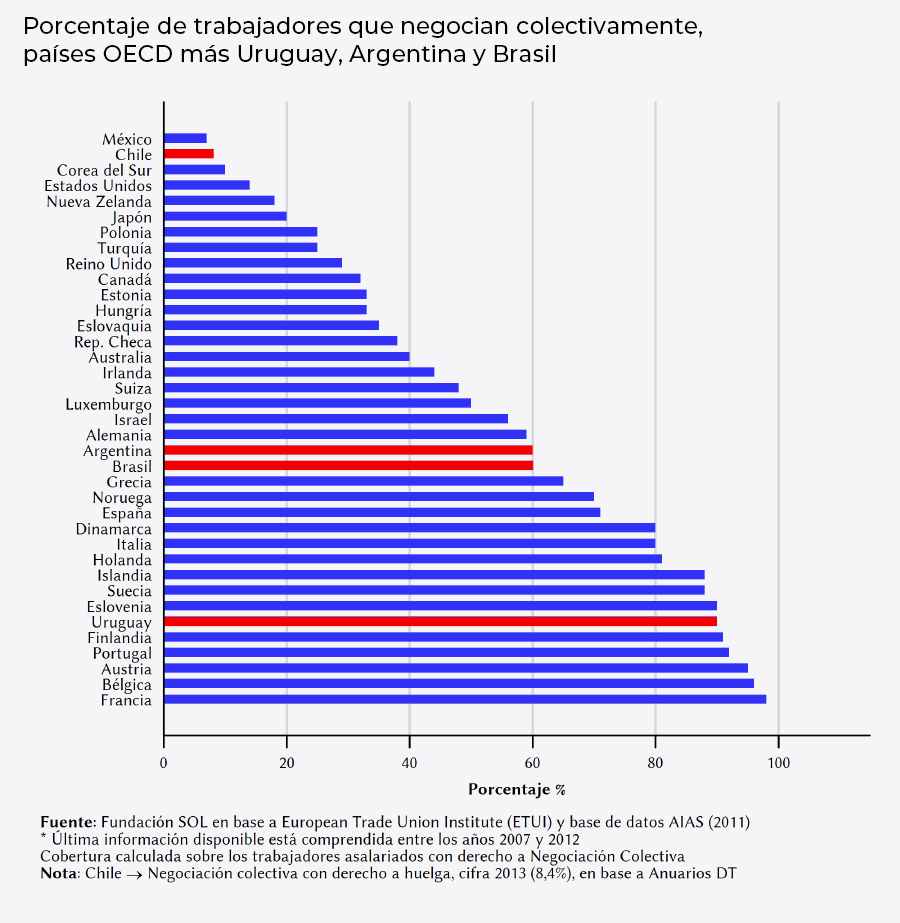 Respecto a la propuesta en materia de negociación colectiva, el investigador de la Fundación Sol, considera interesante ampliarla a nivel ramal, sectorial y territorial. Por ejemplo, explica, si el grupo Luksic tiene inversiones en el sector financiero, en el sector extractivista, y en otras empresas, los trabajadores podrían observar esas relaciones de propiedad para poder negociar entre trabajadores del mismo holding.