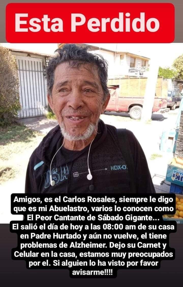 “¿Me ayudan a difundir, porfa? Don Carlos Rosales, el «cantante más desafinado» que salió en Sábados Gigantes, se perdió la semana pasada en #PadreHurtado, tiene principio de Alzheimer Cualquier info al +56954045109, Mario Mansilla (sobrino)”, escribieron en redes sociales.