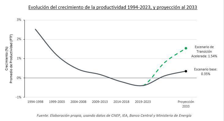 El crecimiento tendencial del período 2024-2033 está estimado en un 0.35% para la productividad y un 1.9% para el PIB, según el último Informe de Política Monetaria (IPoM) de diciembre de 2023 sobre este tema. Con las mejoras sostenidas en la productividad al implementar las políticas de la Transición Acelerada, para 2033 se proyecta una tasa de crecimiento de la productividad del 1.54%, lo que representa un aumento acumulado del 1.19% respecto a la tasa tendencial del IPoM.