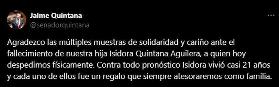 “Contra todo pronóstico Isidora vivió casi 21 años y cada uno de ellos fue un regalo que siempre atesoraremos como familia”, cerró el senador Jaime Quintana.