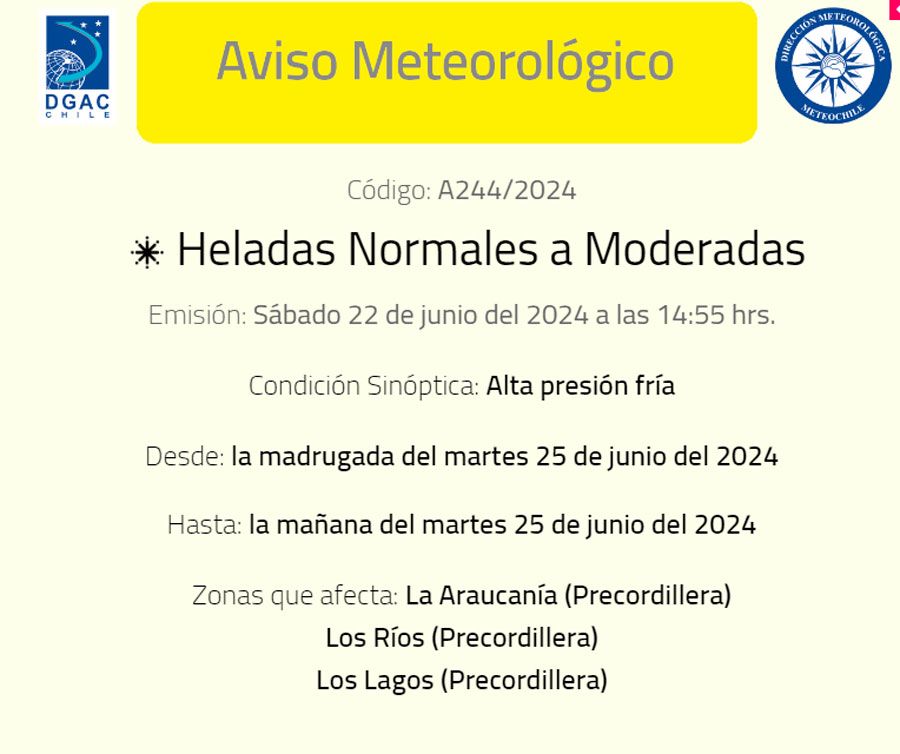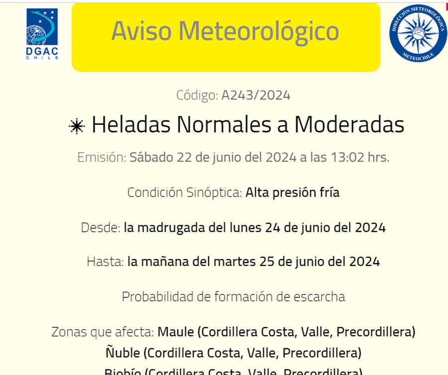 La zona central tampoco escapará a este aviso, pues estas mismas heladas estarán presentes el martes entre las regiones de El Maule y Biobío, con 0°C en las mañanas.