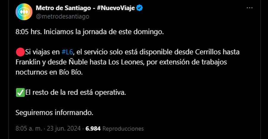 “¡Atención! Por extensión de trabajos nocturnos en la estación Bío Bío, #L6 iniciará servicio desde Cerrillos hasta Franklin y desde Ñuble hasta Los Leones. El resto de la red estará disponible como de costumbre”, informó Metro de Santiago.