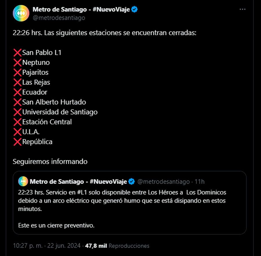 Las estaciones que cerraron desde las 22:00 horas fueron San Pablo, Neptuno, Pajaritos, Las Rejas, Ecuador, San Alberto Hurtado, Universidad de Santiago, Estación Central, U.L.A. y República.