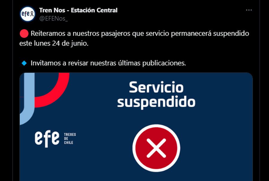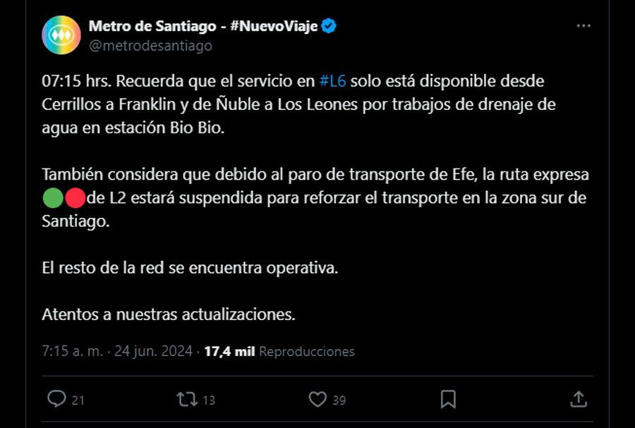 “Recuerda que el servicio en #L6 solo está disponible desde Cerrillos a Franklin y de Ñuble a Los Leones por trabajos de drenaje de agua en estación Biobío”, informó la empresa.
