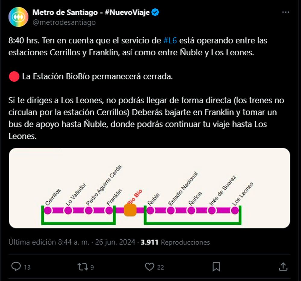 “Ten en cuenta que el servicio de #L6 está operando entre las estaciones Cerrillos y Franklin, así como entre Ñuble y Los Leones”, informó la empresa.