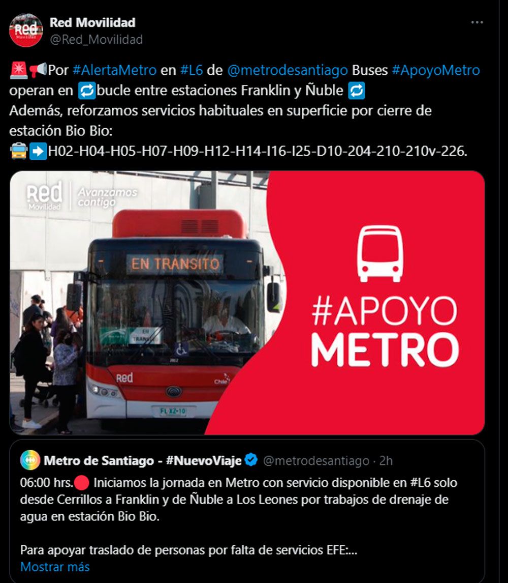 “La Estación Biobío permanecerá cerrada. Si te diriges a Los Leones, no podrás llegar de forma directa. Deberás bajarte en Franklin y tomar un bus de apoyo hasta Ñuble, donde podrás continuar tu viaje hasta Los Leones”, añadió.