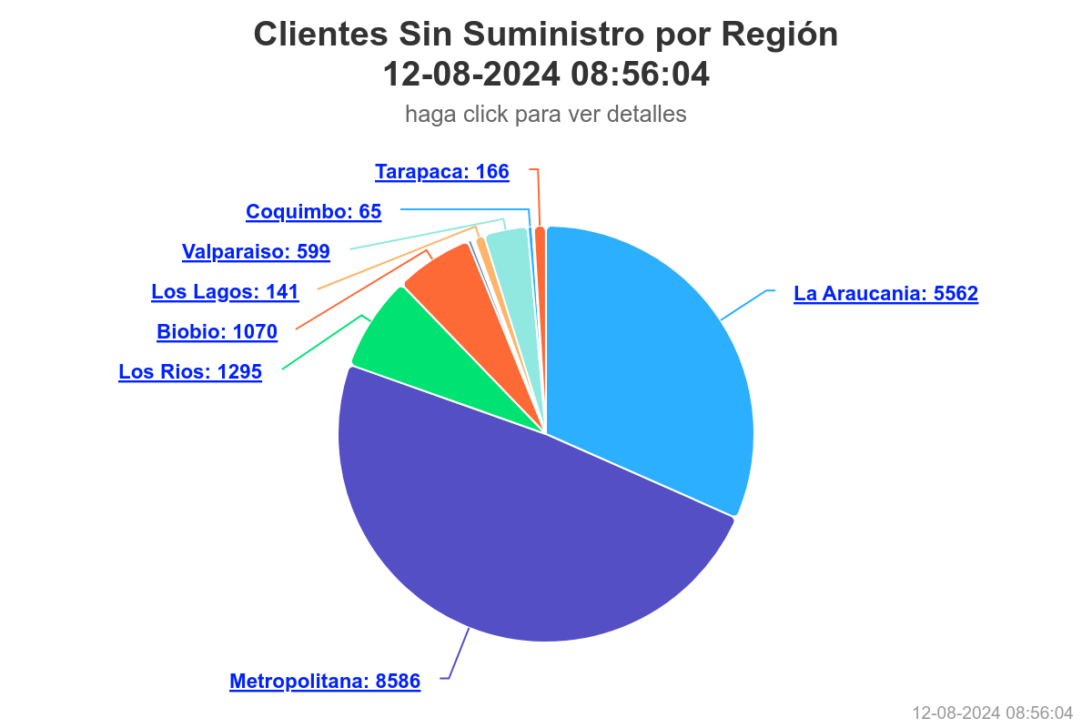 A las 09:00 horas de este lunes 12 de agosto, 8.568 familias de la Región Metropolitana siguen sin energía eléctrica, problemas que han debido sufrir por 11 días seguidos debido a la demora de Enel en reponer el servicio.