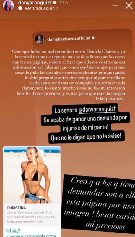 “Como soy bien mujer para mis cosas le pido las disculpas correspondientes, porque quizás le debí preguntar antes de decir que, al parecer, ella se dedicaba a ser dama de compañía sin afirmar nada, claramente. Lo siento mucho, Dani. No fue mi intención herirte. Besos, preciosa, y es una pena que usen la imagen de las personas” cerró Aránguiz.