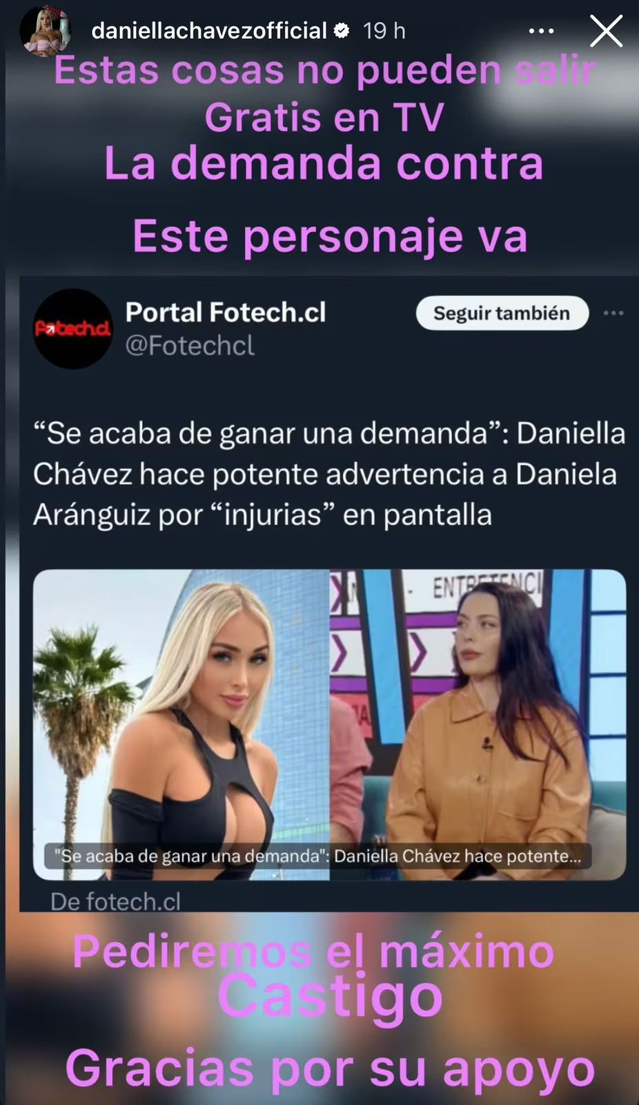 “Después de la burla de Daniella Aránguiz, confirmo la demanda por injurias graves. Nos vemos en tribunales muy pronto. Yo quiero cárcel”, cerró.