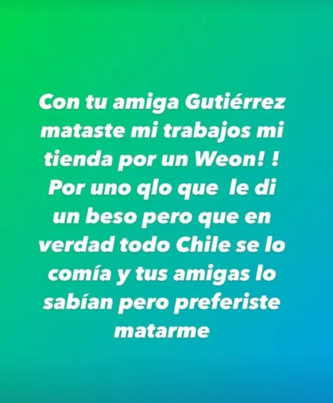 “Aaaa verdad que soy a putx de tu historia y te aconsejaron mal… Con tu amiga Gutiérrez mataste mi trabajo y tienda por un weón. Por un qlo que le di un beso, pero que en verdad todo Chile se lo comía y tus amigas lo sabían, pero preferiste matarme”, escribió Valenzuela.