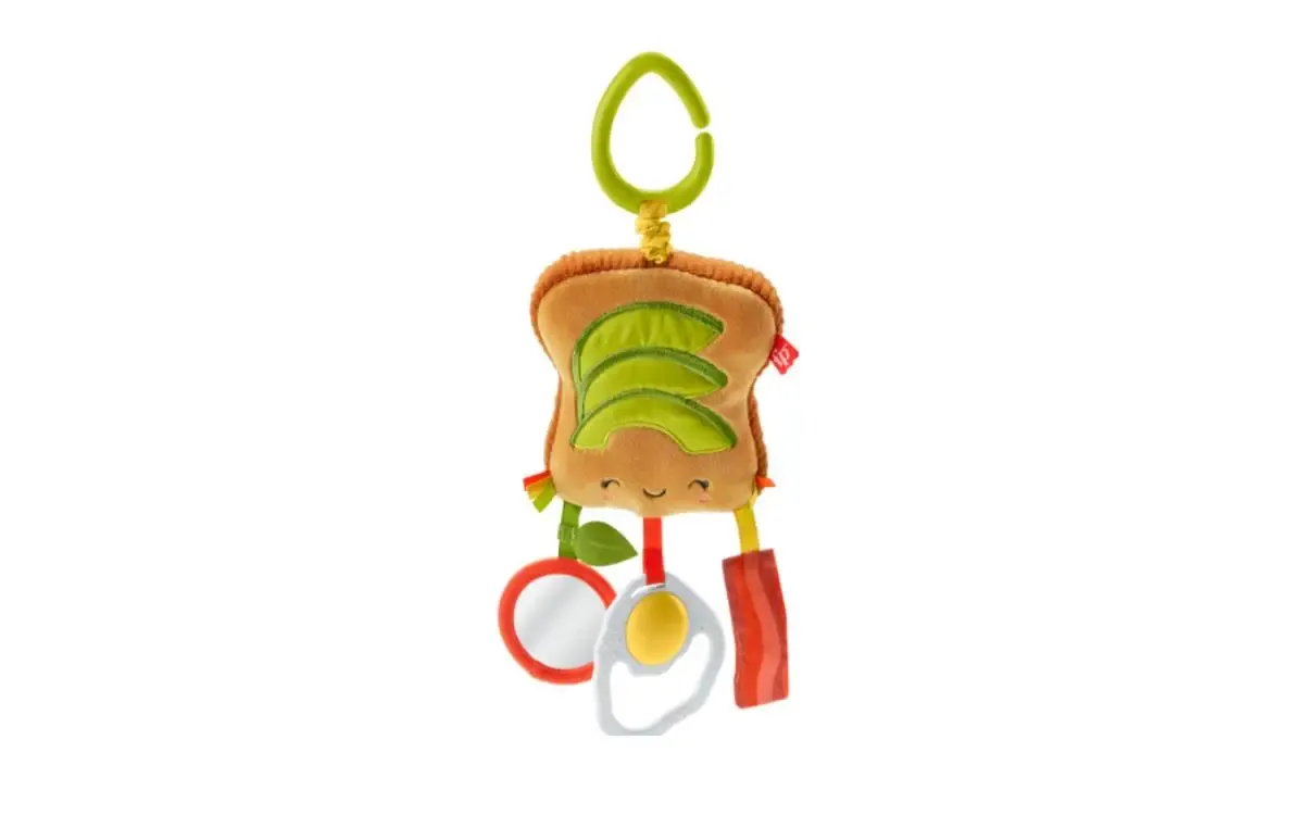 Se trata de un “huevo de juguete para cochecito brunch & go”, que simula una tostada de palta con tres juguetes unidos: un tomate espejo, tocino arrugado y un huevo para morder.