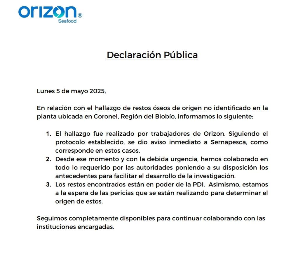 Mediante un comunicado de prensa, la empresa pesquera Orizon de Coronel informó que sus trabajadores, en medio de sus faenas de procesamiento, encontraron restos óseos que no pudieron ser identificados, por lo que se dio aviso a las autoridades.
