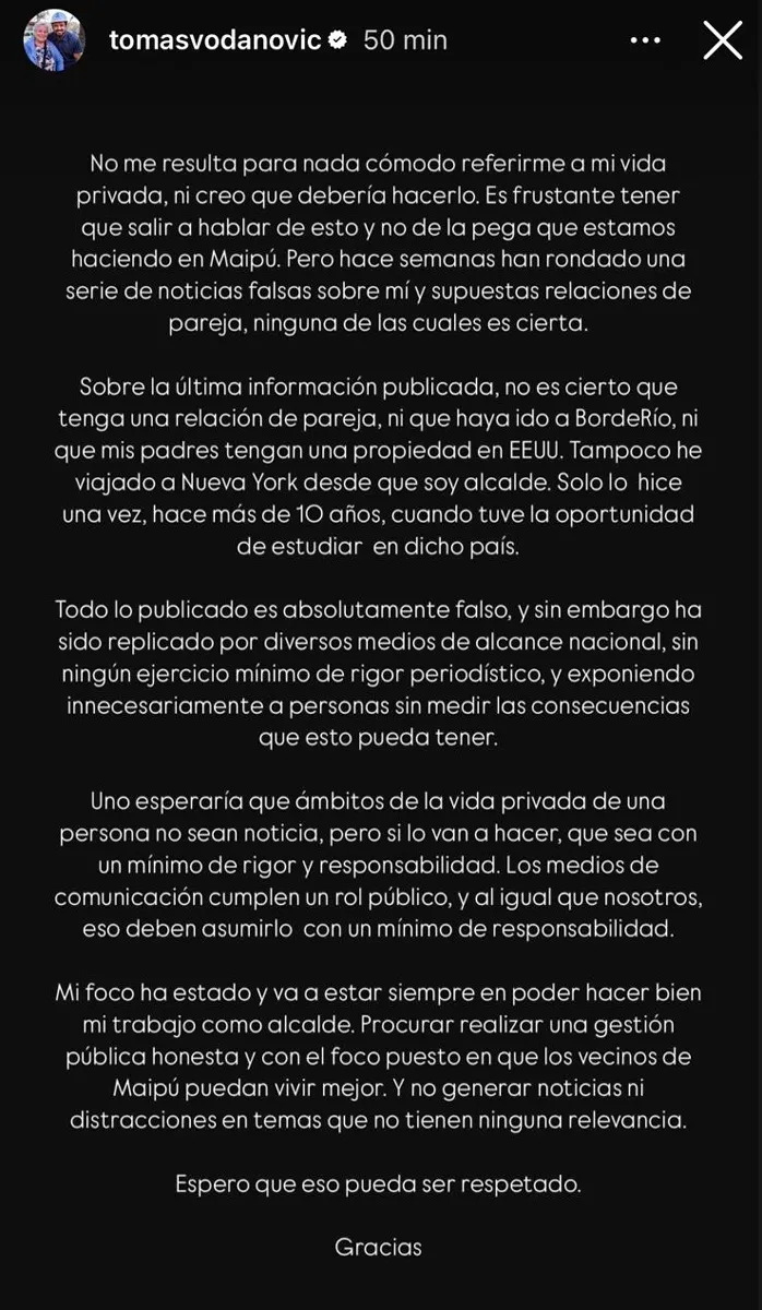 El alcalde Vodanovic comenzó diciendo que “no me resulta para nada cómodo referirme a mi vida privada, ni creo que deba hacerlo. Es frustrante tener que salir a hablar de esto y no de la pega que estamos haciendo en Maipú”.