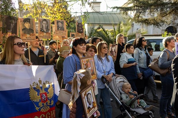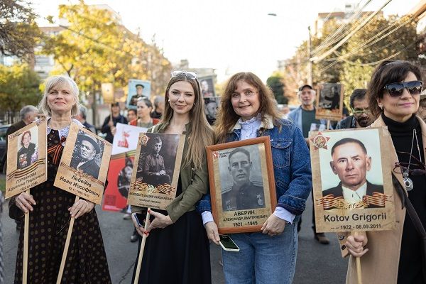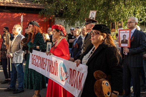 Ese mismo día, partió desde el templo ortodoxo el « Regimiento Inmortal», que congregó a ciudadanos rusos con retratos de sus antepasados que lucharon en este conflicto. En esta procesión también participaron personas chilenas, miembros del grupo de recreación histórico militar « Estrella Roja» y activistas de la « Komanda Bonk» que llegaron desde la región de Araucanía.