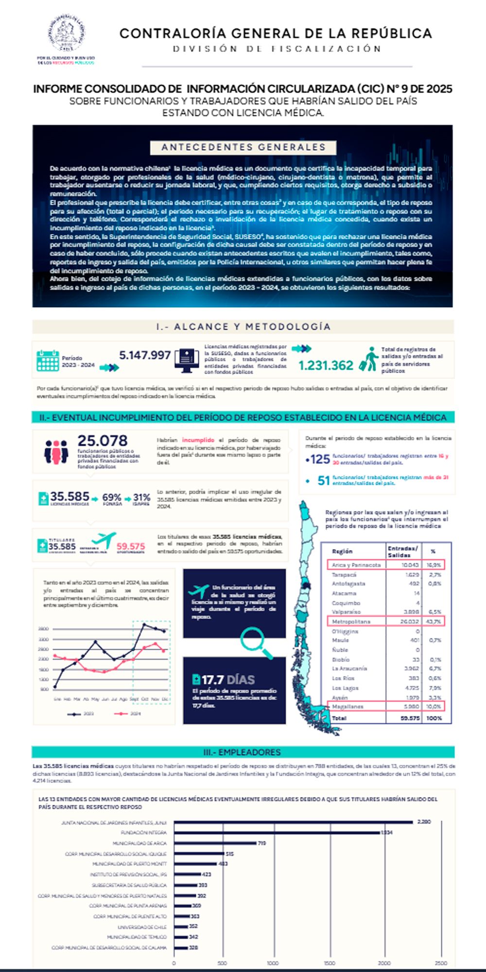 “Durante el periodo de reposo establecido en la licencia médica, 125 funcionarios/ trabajadores registran entre 16 y 30 entradas/salidas del país, mientras que 51 funcionarios/ trabajadores registran más de 31 entradas/salidas del país”, detalla el informe.