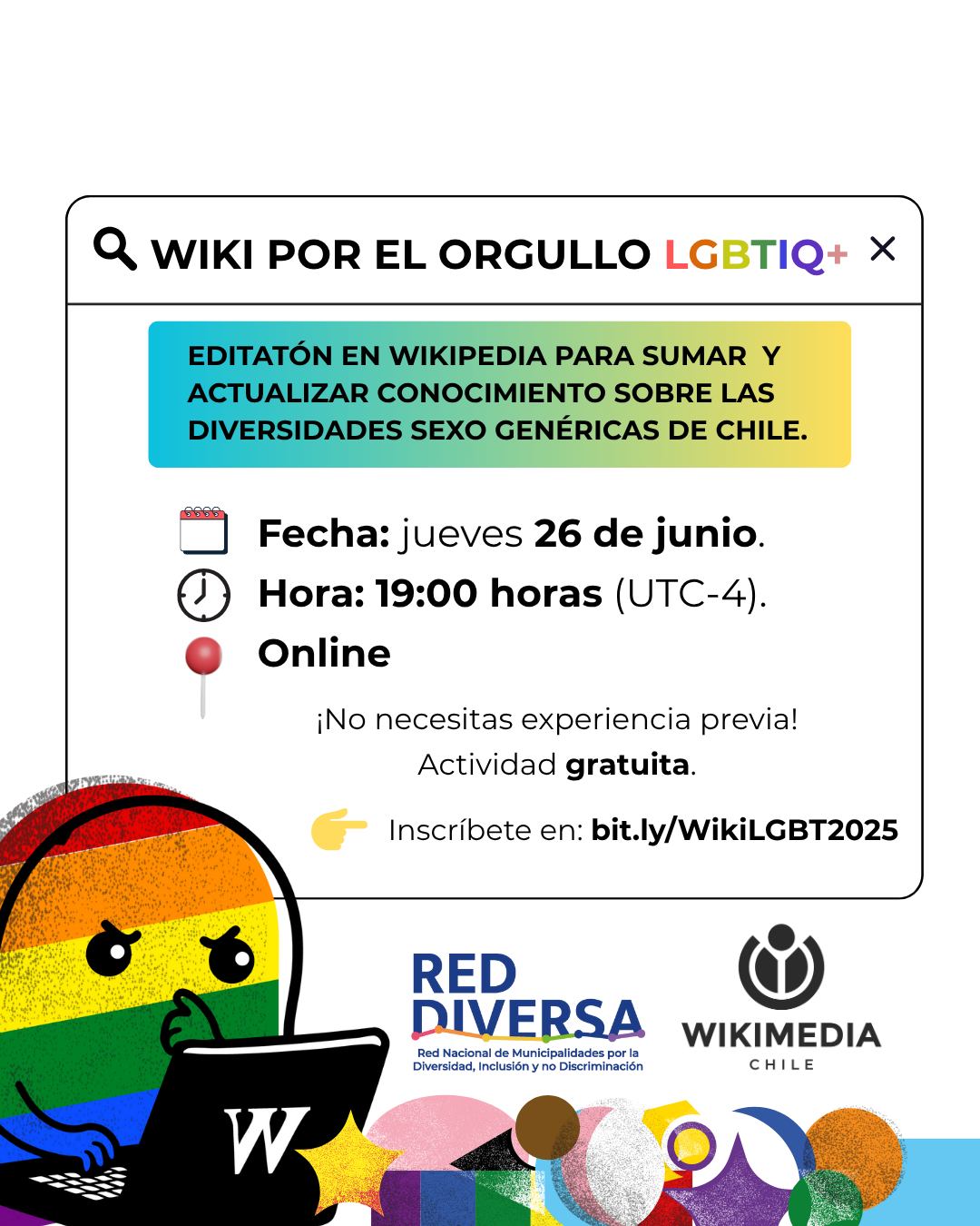 En el marco de la conmemoración del Mes del Orgullo, Wikimedia Chile impartirá un taller gratuito con el objetivo de capacitar a todo público para que editen en el sitio Wikipedia biografías de personas que pertenecen a la comunidad LGBTIQ+ chilenas.