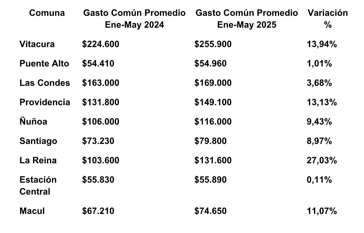 Es decir, de 94 comunas analizadas el incremento promedio de gastos comunes fue de $87.620, mientras que para el mismo periodo pero del 2024 fue de $80.920.