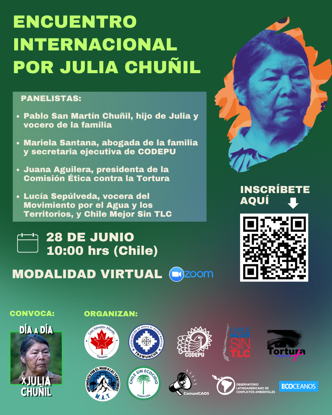 Este sábado 28 de junio, a las 10:00 horas de Chile, se realizará el Encuentro Internacional por Julia Chuñil, una instancia virtual organizada por el "Espacio Día a Día por Julia Chuñil".