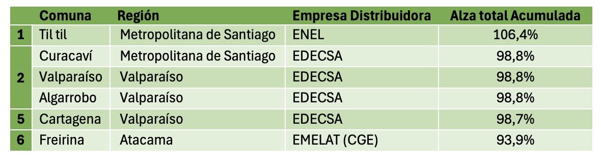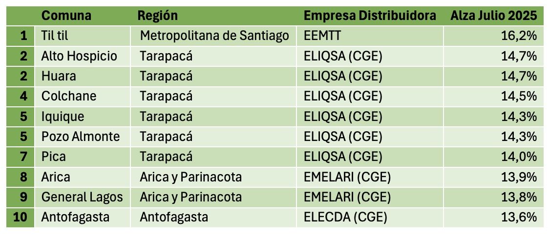 La comuna más afectada es Til Til, donde los hogares abastecidos por la distribuidora EEMTT enfrentan una variación tarifaria del 106,4% desde que comenzaron los aumentos en julio de 2024.