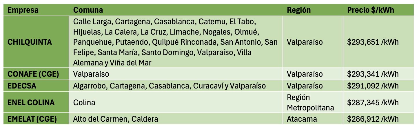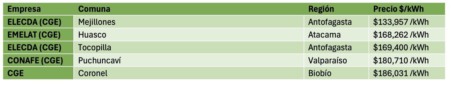 La lista la encabezan comunas abastecidas por CHILQUINTA, donde el kilowatt hora alcanza los $293,651.