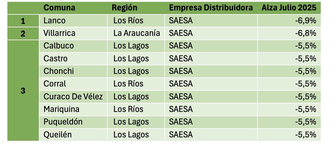 Es el caso de comunas del sur bajo la distribuidora SAESA, especialmente en las regiones de Los Ríos, Los Lagos y La Araucanía, donde gracias a contratos eléctricos más baratos, sus habitantes han visto un impacto considerablemente menor.
