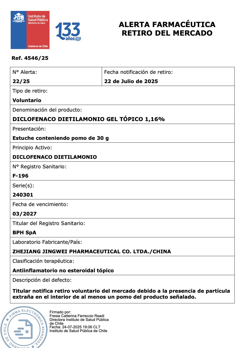 El Instituto de Salud Pública (ISP) emitió una nueva alerta por irregularidades con medicamentos, esta vez por la presencia de una extraña partícula en la crema antiinflamatoria "Diclofenaco Dietilamonio Gel Tópico 1,16%".