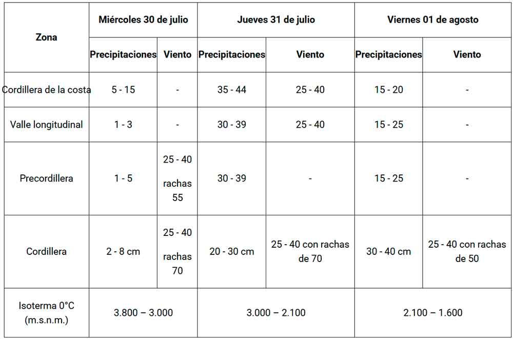 La isoterma cero rondará entre los 2.100 a 3.000 metros de altura, lo que la torna muy peligrosa debido a que podría llover en zonas donde cayó nieve en semanas anteriores, aumentando el peligro de remoción de masa en la zona precordillerana.