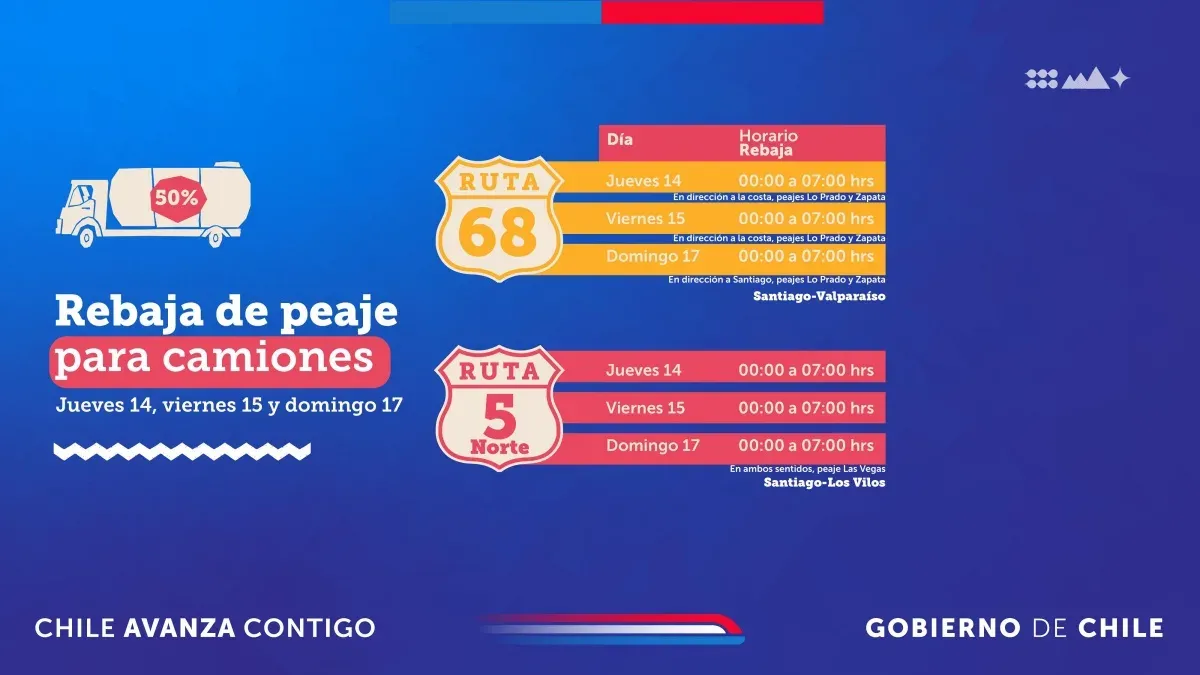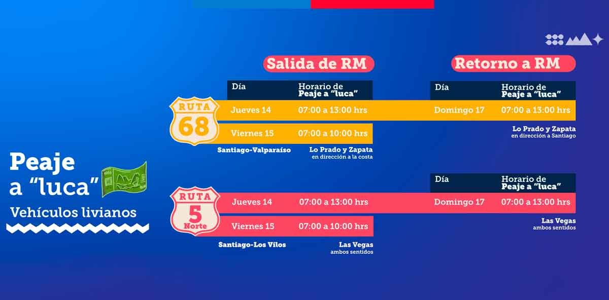Con motivo de descongestionar las principales carreteras de salida desde la Región Metropolitana, el Ministerio de Obras Públicas (MOP) dispuso desde ayer jueves la implementación de los clásicos Peaje a Luca y restricción de horarios de camiones.