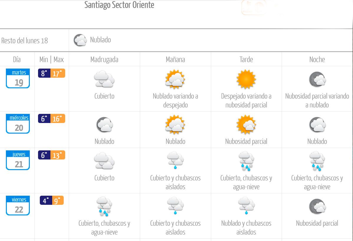 La Dirección Meteorológica de Chile (DMC) confirmó chubascos de agua-nieve para la zona oriente de Santiago, evento que podría ocurrir la tarde de este jueves 21 de agosto y prolongarse hasta la mañana del viernes 22.