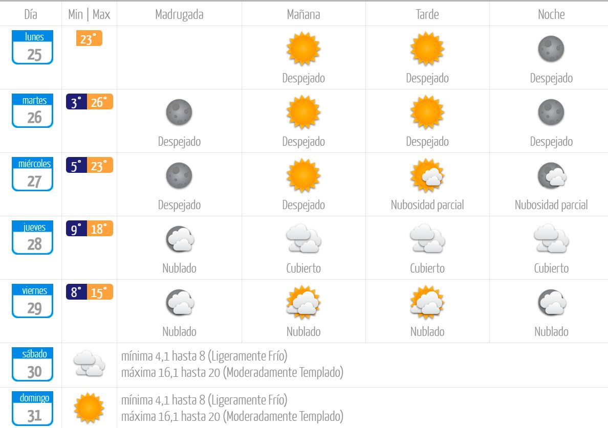 Pero por un momento solamente. Esto, porque el miércoles baja a 22°C y el jueves, por el ingreso de la vagada costera, la máxima no se elevará más allá de los 19°C.