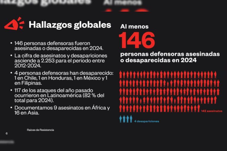 El informe global registró 50 casos menos que en 2023 y pese a que la cifra a nivel mundial es la más baja en diez años, sus autores advierten que esto no significa que la violencia contra defensores se esté reduciendo. Al contrario, señalan que otras agresiones están en ascenso.