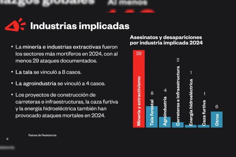 La autora del informe destaca que en muchos otros casos no logran tener información suficiente para vincular los asesinatos con las luchas por el territorio, lo que también contribuye a la impunidad en la mayoría de los casos. Sin embargo, comenta que la minería e industrias extractivas fueron el sector más mortífero en 2024, con al menos 29 ataques contra defensores.