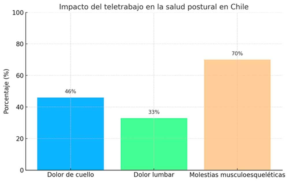 Un estudio realizado por la Universidad de Chile durante la pandemia reveló que 46 % de los trabajadores en modalidad remota presentaron dolores cervicales y un 33 % reportó dolor lumbar. La causa más común: mobiliario inadecuado.