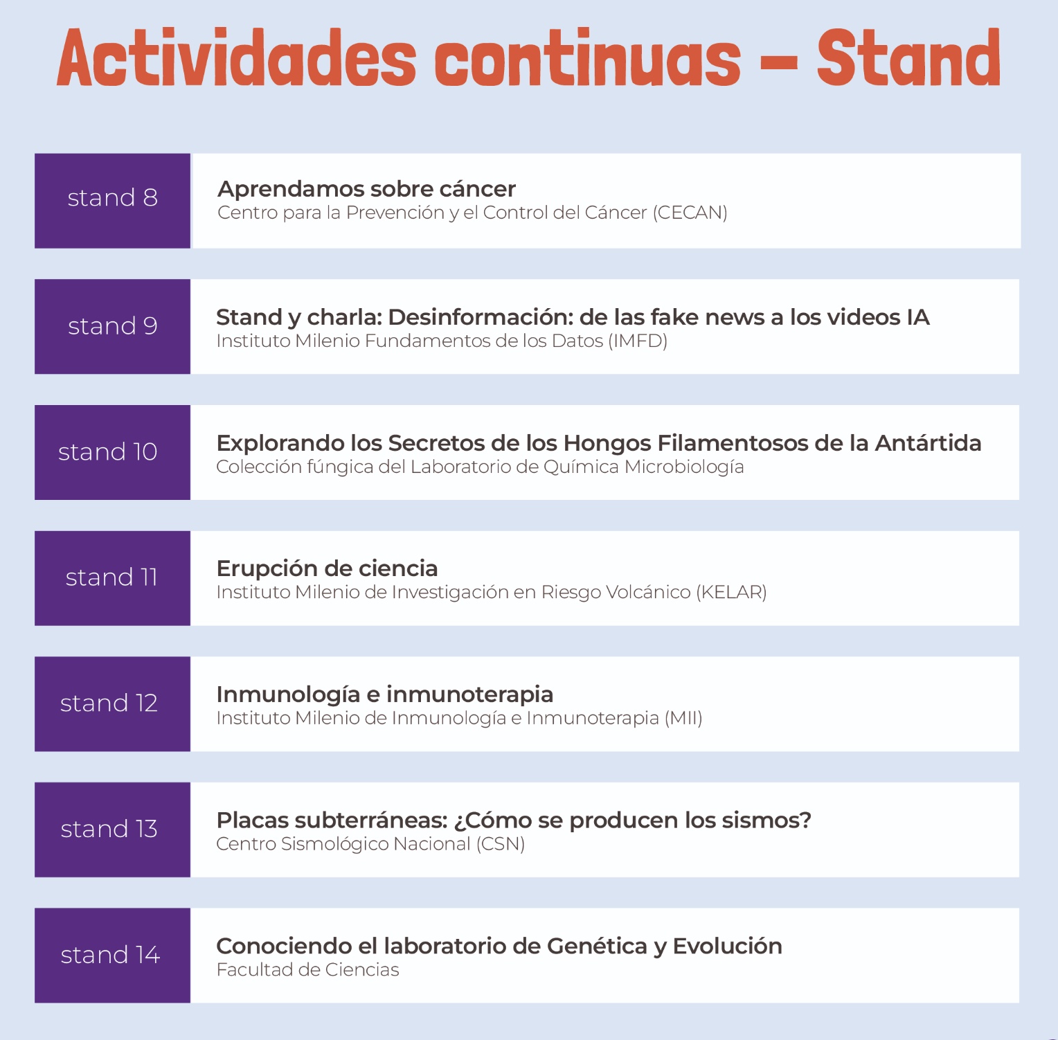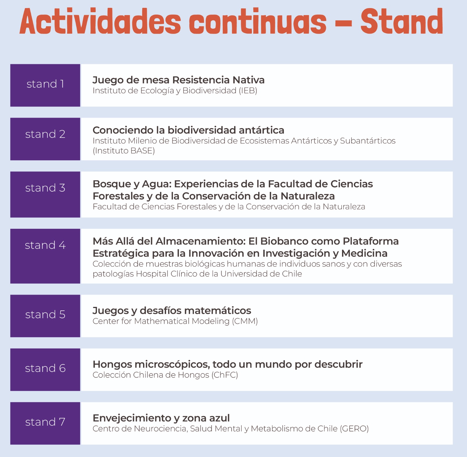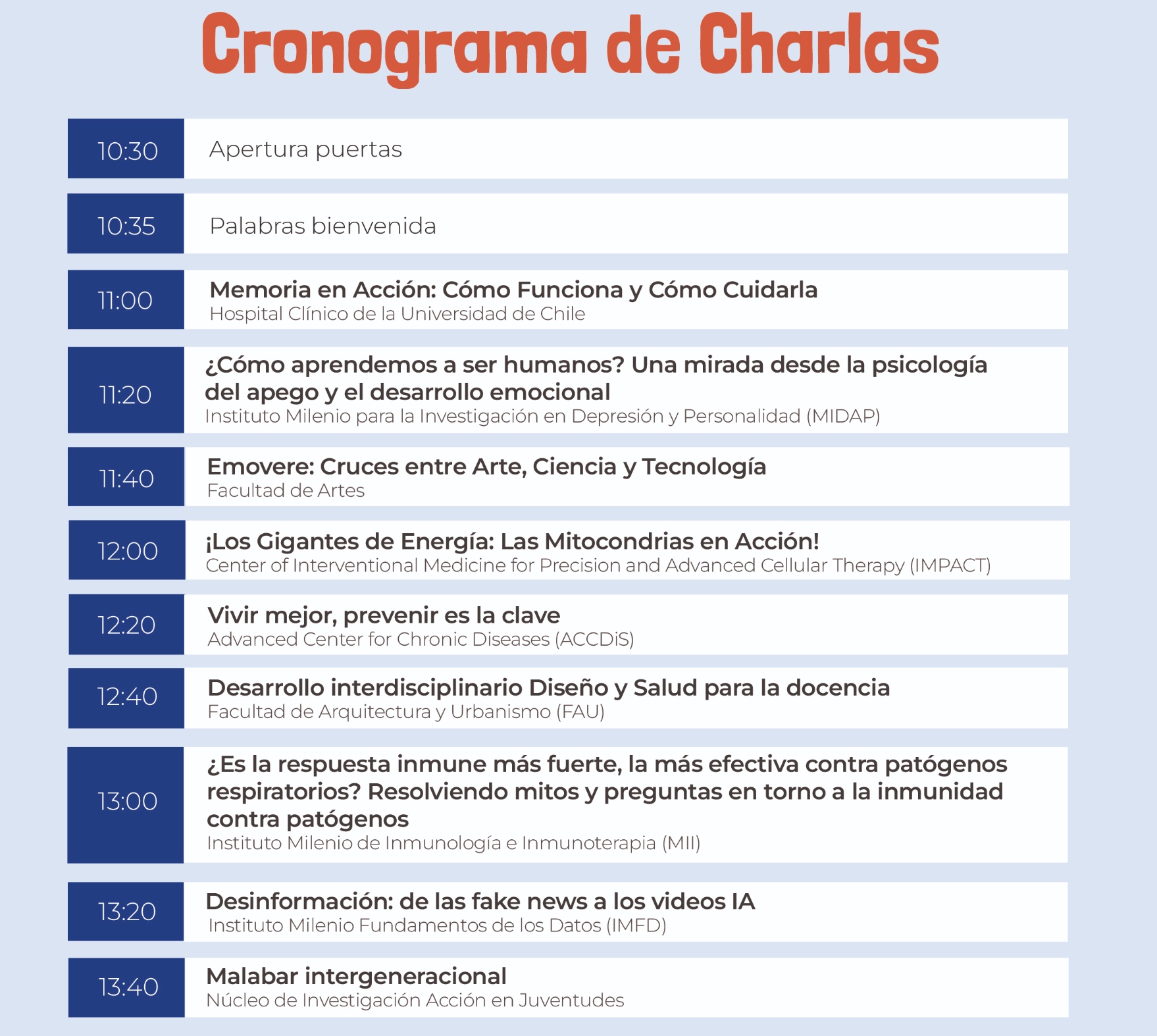 Este año, la programación incluye más de 20 stands interactivos y una serie de charlas didácticas dictadas por académicos e investigadores de la Universidad de Chile, quienes compartirán su trabajo a través de experiencias accesibles para todas las edades.