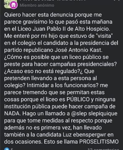 Al respecto, el presidente nacional del Magisterio, Mario Aguilar, declaró que “esto es claramente ilegal, proselitismo directamente a la candidatura de José Antonio Kast, en un colegio público de la comuna de Alto Hospicio”.
