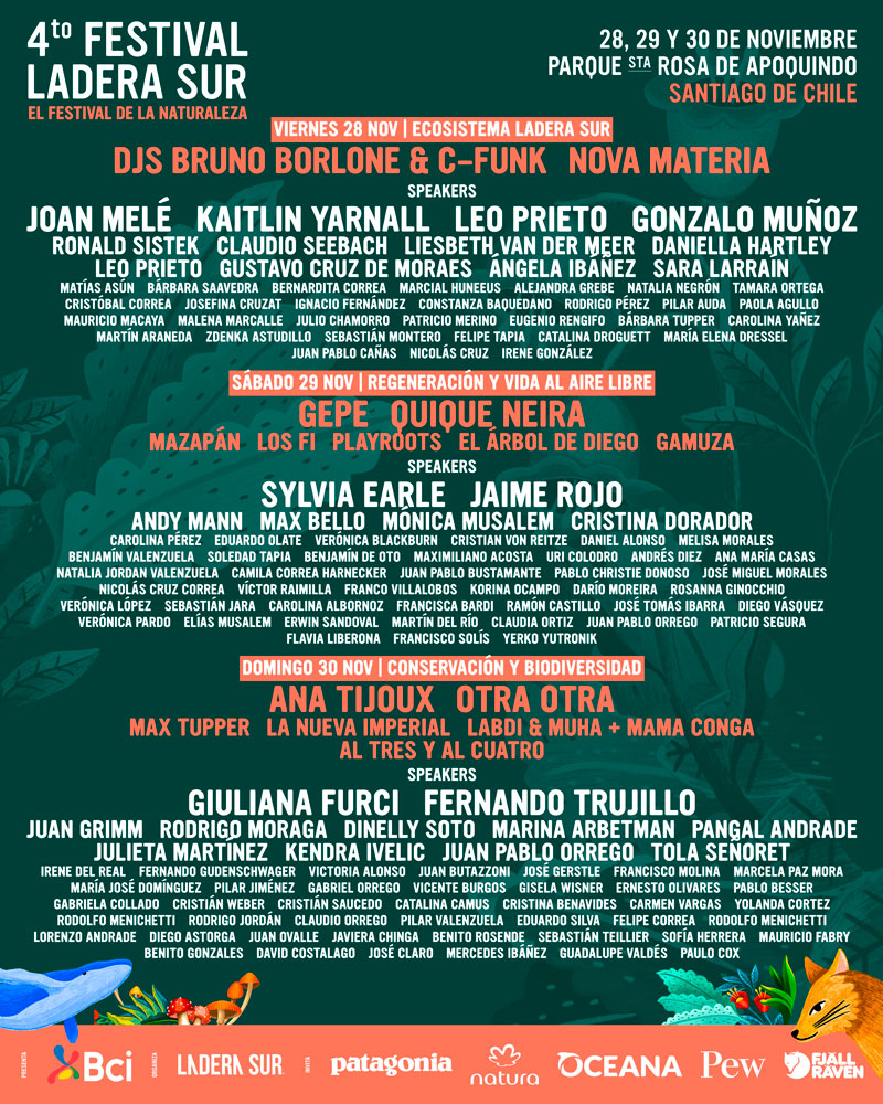 Además de su propuesta musical, la cuarta versión del Festival Ladera Sur reunirá a más de 120 speakers nacionales e internacionales que compartirán su conocimiento y experiencias en torno a la naturaleza, la ciencia y la sostenibilidad.