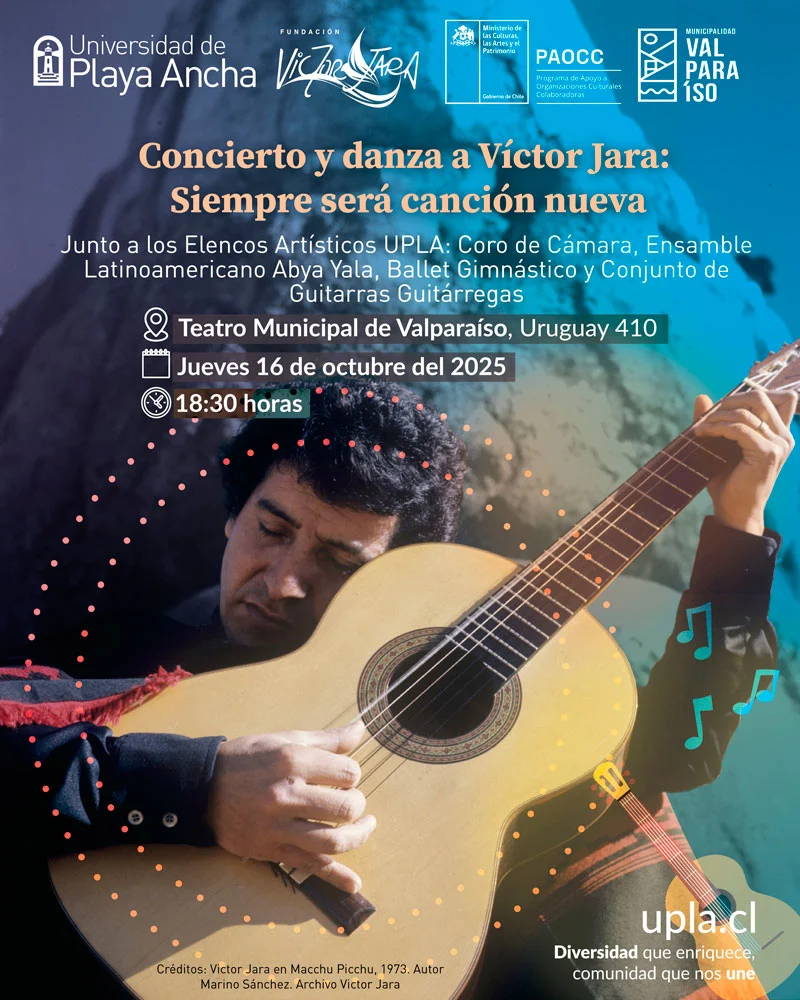 Este jueves 16 de octubre, a las 18:30 horas, el Teatro Municipal de Valparaíso será escenario del concierto y danza “Siempre será canción nueva”, un emotivo homenaje a Víctor Jara organizado por la Universidad de Playa Ancha (UPLA) en el marco de su reciente convenio de colaboración con la Fundación Víctor Jara.