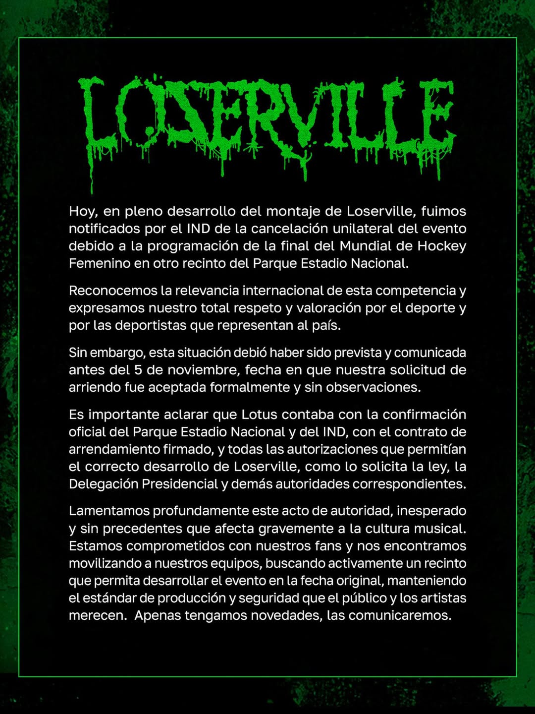 “Hoy, en pleno desarrollo del montaje de Loserville, fuimos notificados por el IND de la cancelación unilateral del evento debido a la programación de la final del Mundial de Hockey Femenino en otro recinto del Parque Estadio Nacional”, comenzó el comunicado de Lotus.