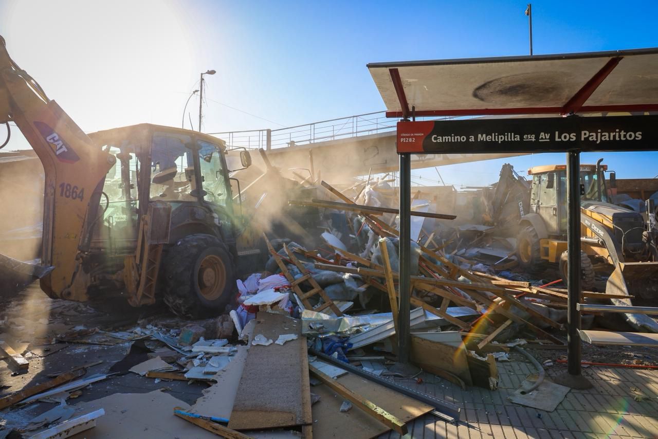Con maquinaria pesada, pero luego de aplicar soluciones a algunas familias, se comenzó a echar abajo las edificaciones en la zona de Camino a Melipilla con Avenida Pajaritos.