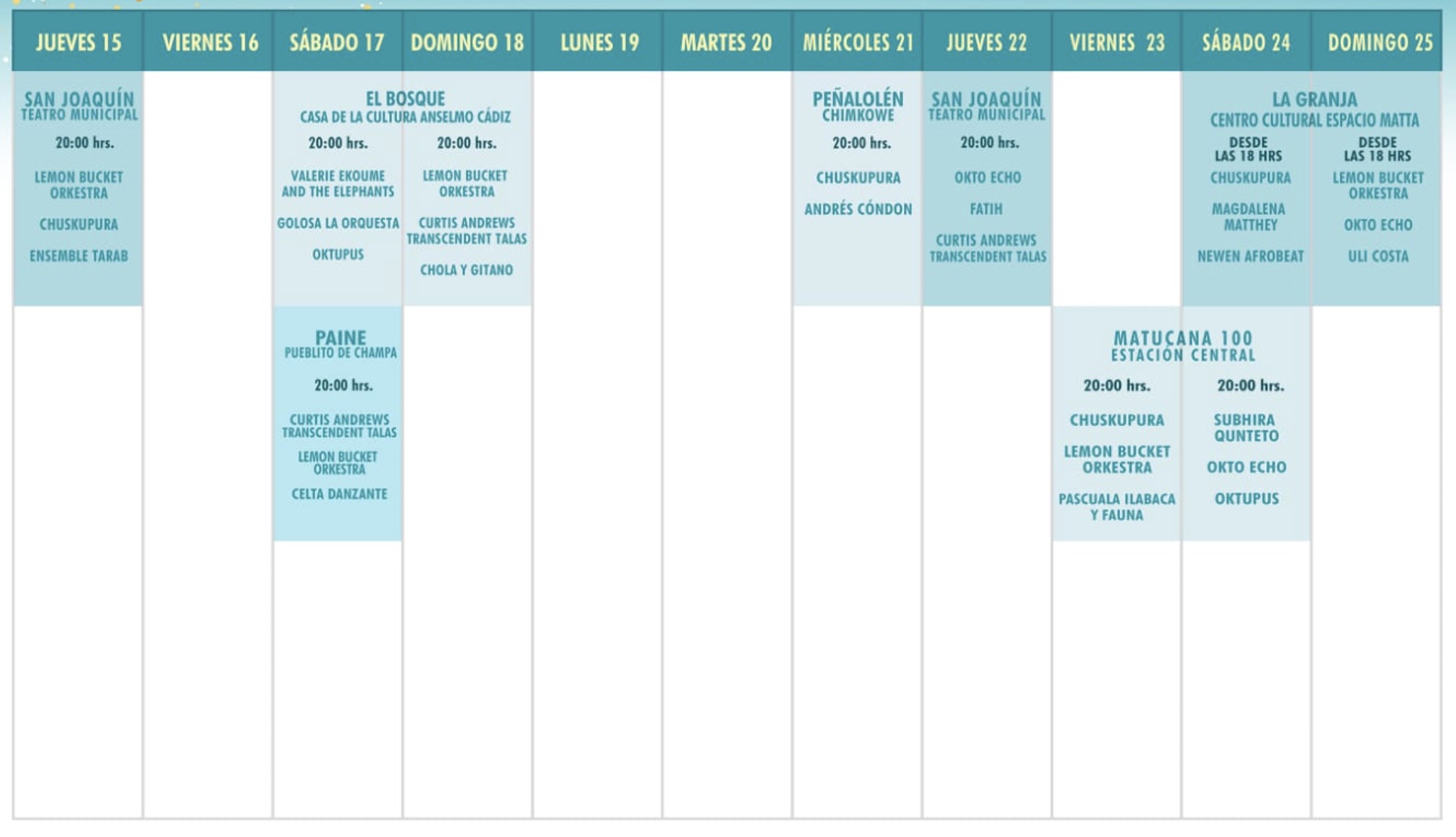 Con una cartelera ampliada y la participación de artistas provenientes de distintas latitudes, el Festival Músicas del Mundo conmemorará su versión XXV durante enero de 2026 con 20 bandas que se presentarán de forma gratuita en seis comunas de Santiago.