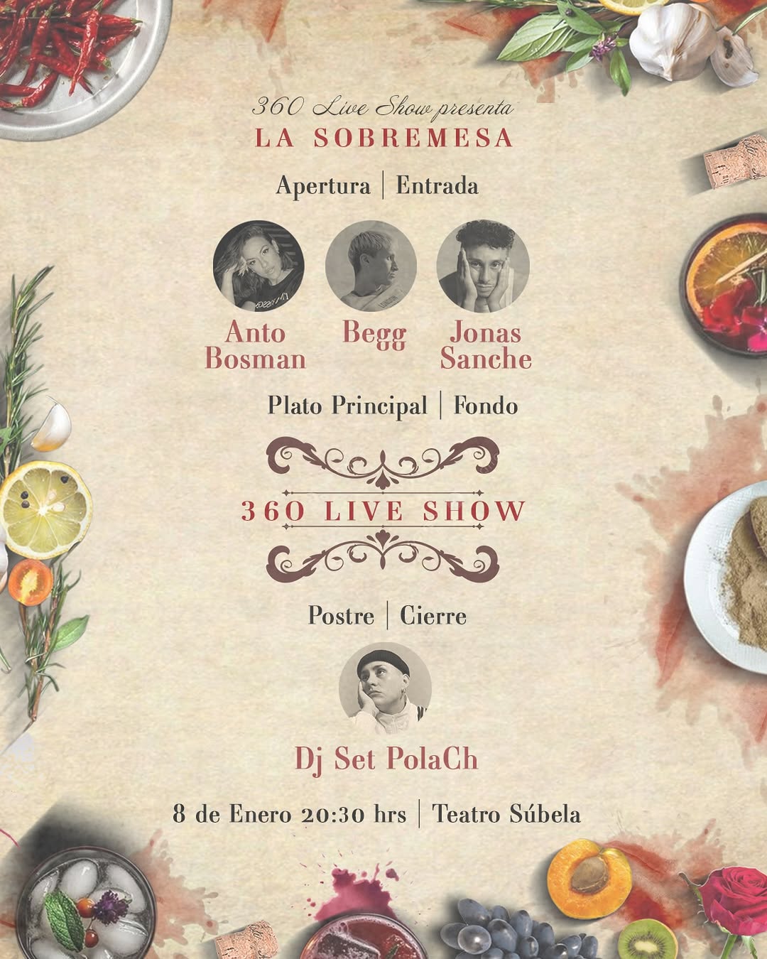 La propuesta centra su mirada en el cuestionamiento del poder y la fama a través de "El Madrileño (La Sobremesa)", tomando como eje sonoro la versión extendida del aclamado álbum del cantante español C. Tangana. Además, a nivel visual, la obra se nutre de la crudeza de la película "El cocinero, el ladrón, su mujer y su amante" (1989) del cineasta británico Peter Greenaway, logrando una atmósfera que explora tensiones y jerarquías de un sistema social desgarrador.