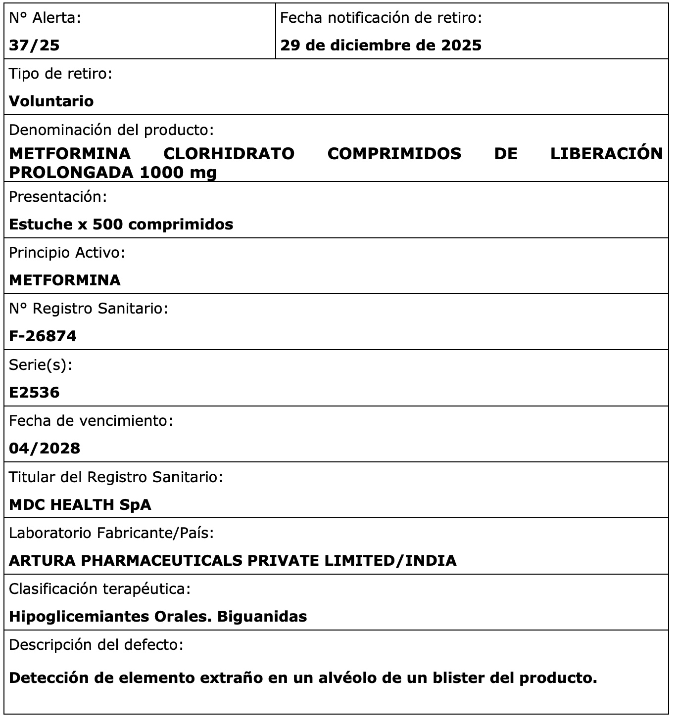 Se trata del fármaco Metformina Clorhidrato comprimidos de liberación prolongada 1000 mg, según se señala en el documento publicado en el sitio web de la autoridad sanitaria.