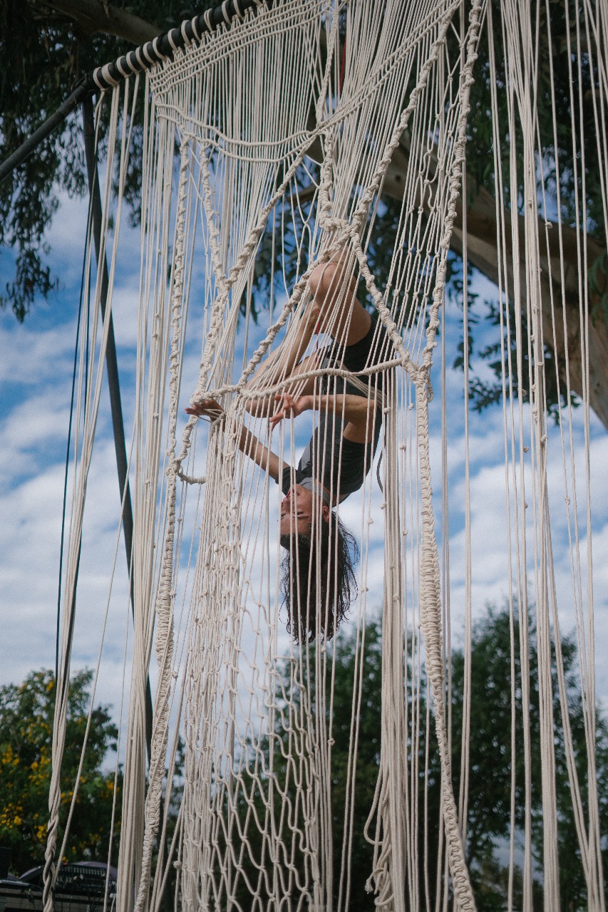 La obra propone una experiencia escénica que articula teatro físico, técnicas aéreas, danza y música, desplegadas sobre una estructura central que remite a un telar monumental de múltiples cuerdas.