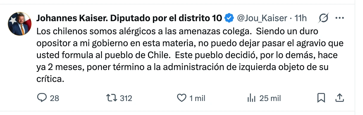 “Los chilenos somos alérgicos a las amenazas, colega”, escribió Kaiser, agregando que, pese a ser un duro opositor al Gobierno en esta materia, no podía dejar pasar el agravio formulado al pueblo de Chile.