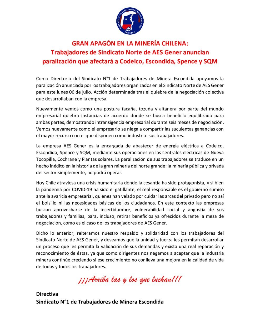 En ese contexto, este viernes el Directorio del Sindicato N°1 de Trabajadores de Minera Escondida, anunció que en apoyo a la paralización del Sindicato Norte de AES Gener para este lunes 6 de julio, lo cual se traducirá en la afectación de las faenas de Codelco, Escondida, Spence y SQM, a quienes AES Gener abastece de electricidad.
