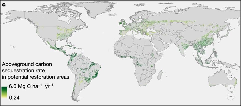 El estudio presenta mapas globales con las distintas posibilidades de recuperación del crecimiento de bosques naturales en regiones y sitios donde es una buena opción (ver figura abajo).